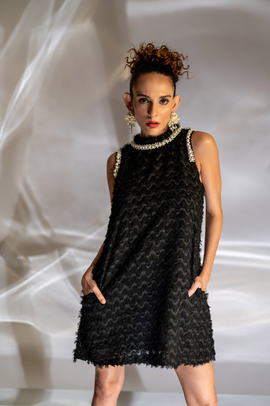 Black Feather Dress With Pearl Detail