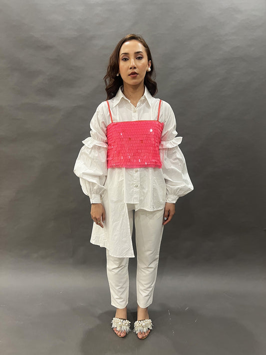 Asymmetric Shirt With Hot Pink Sequin Bustier
