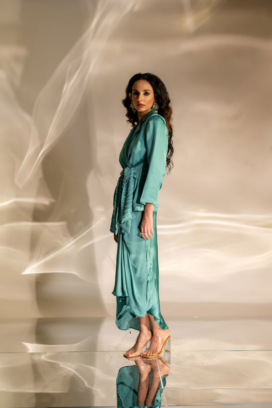 Noor Embellished Peplum Blazer and Skirt Set in Teal Blue