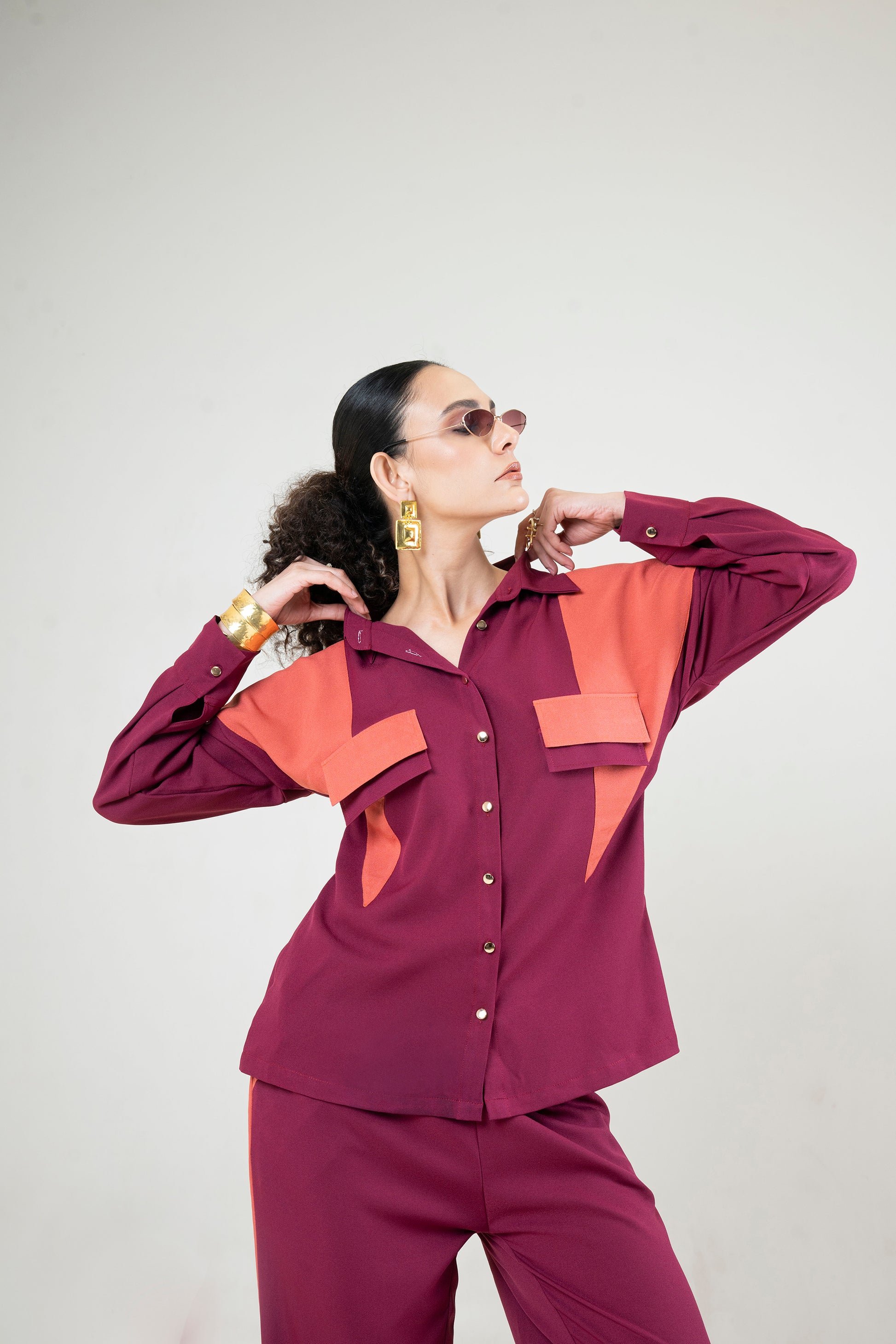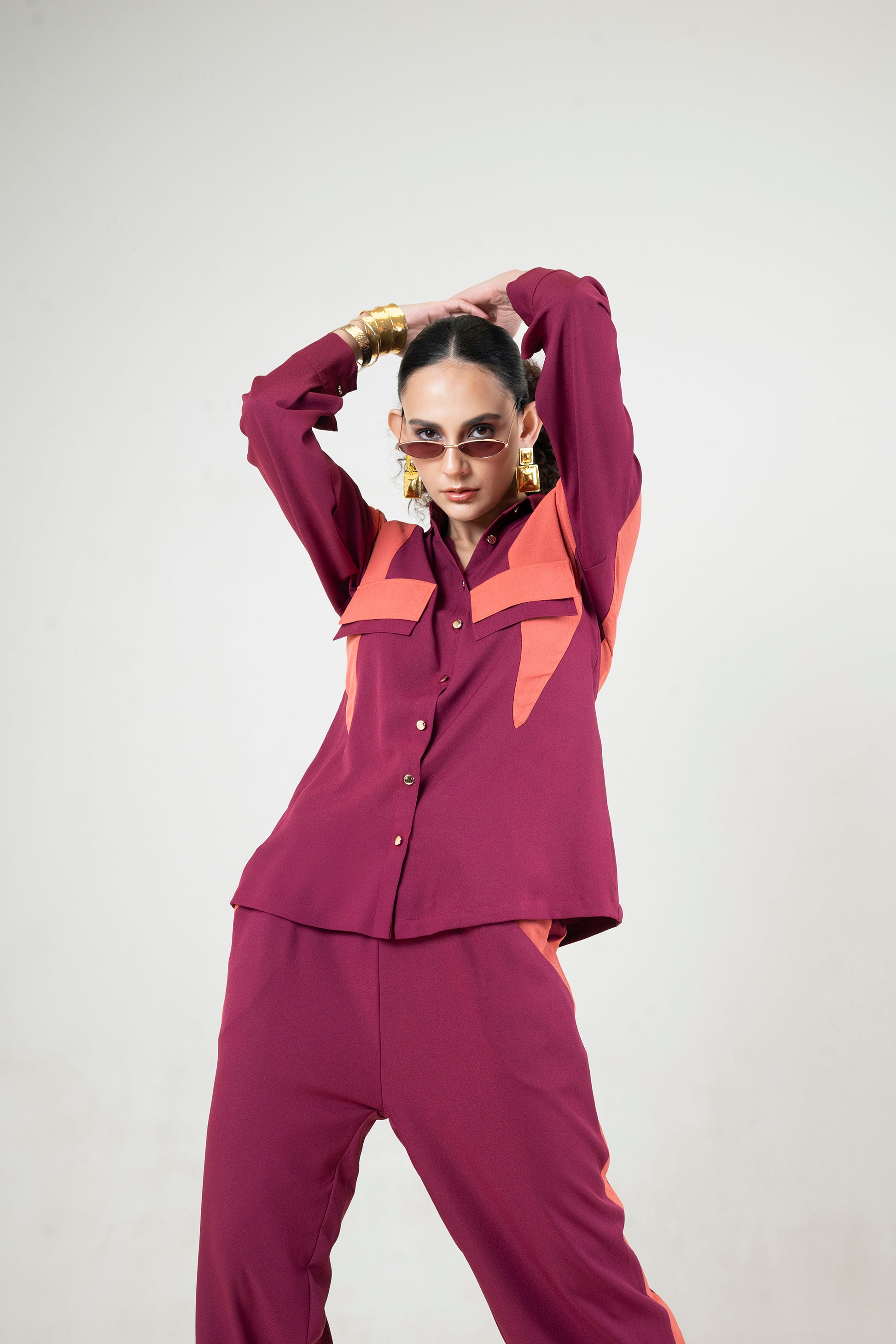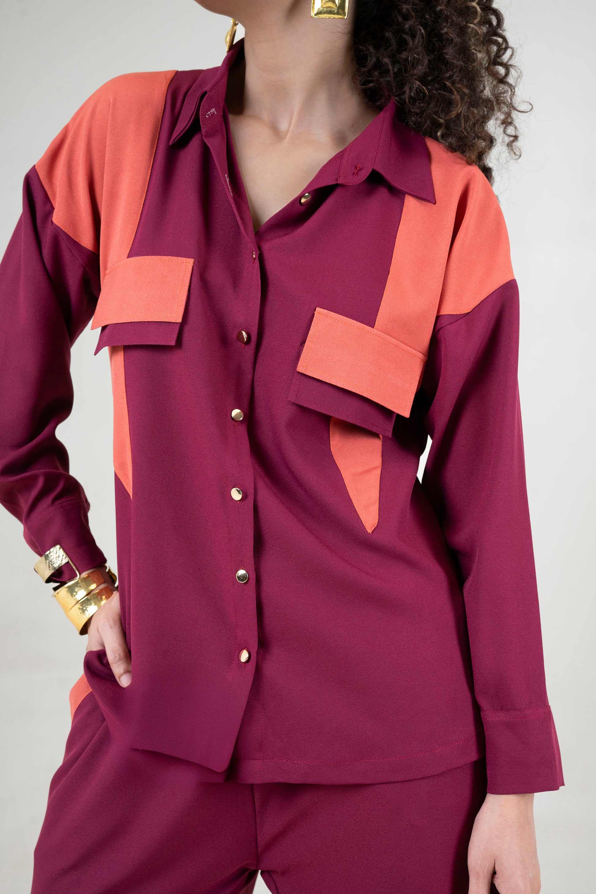 Collared shirt with full sleeves and cuffs featuring contrasting panel details