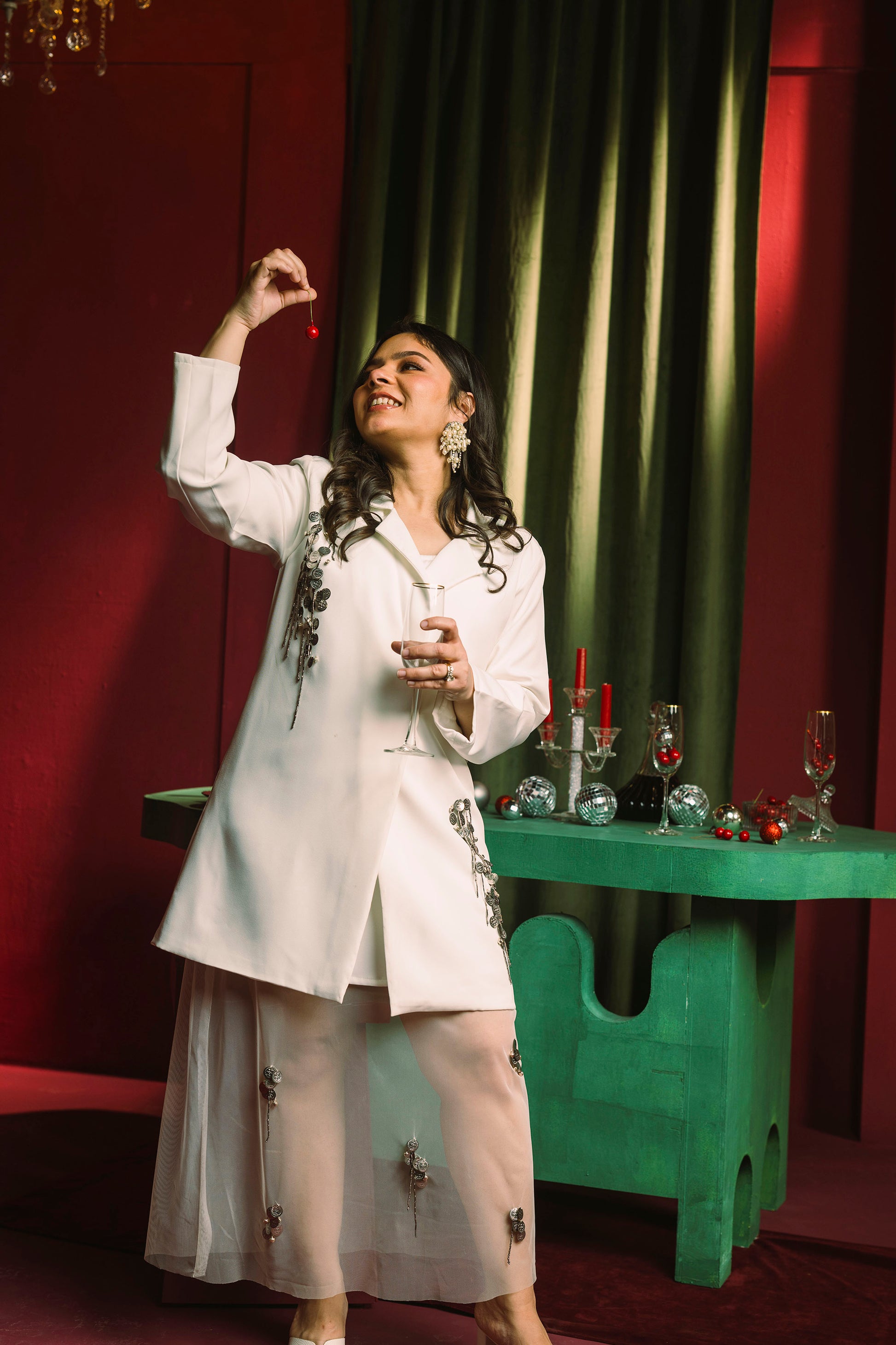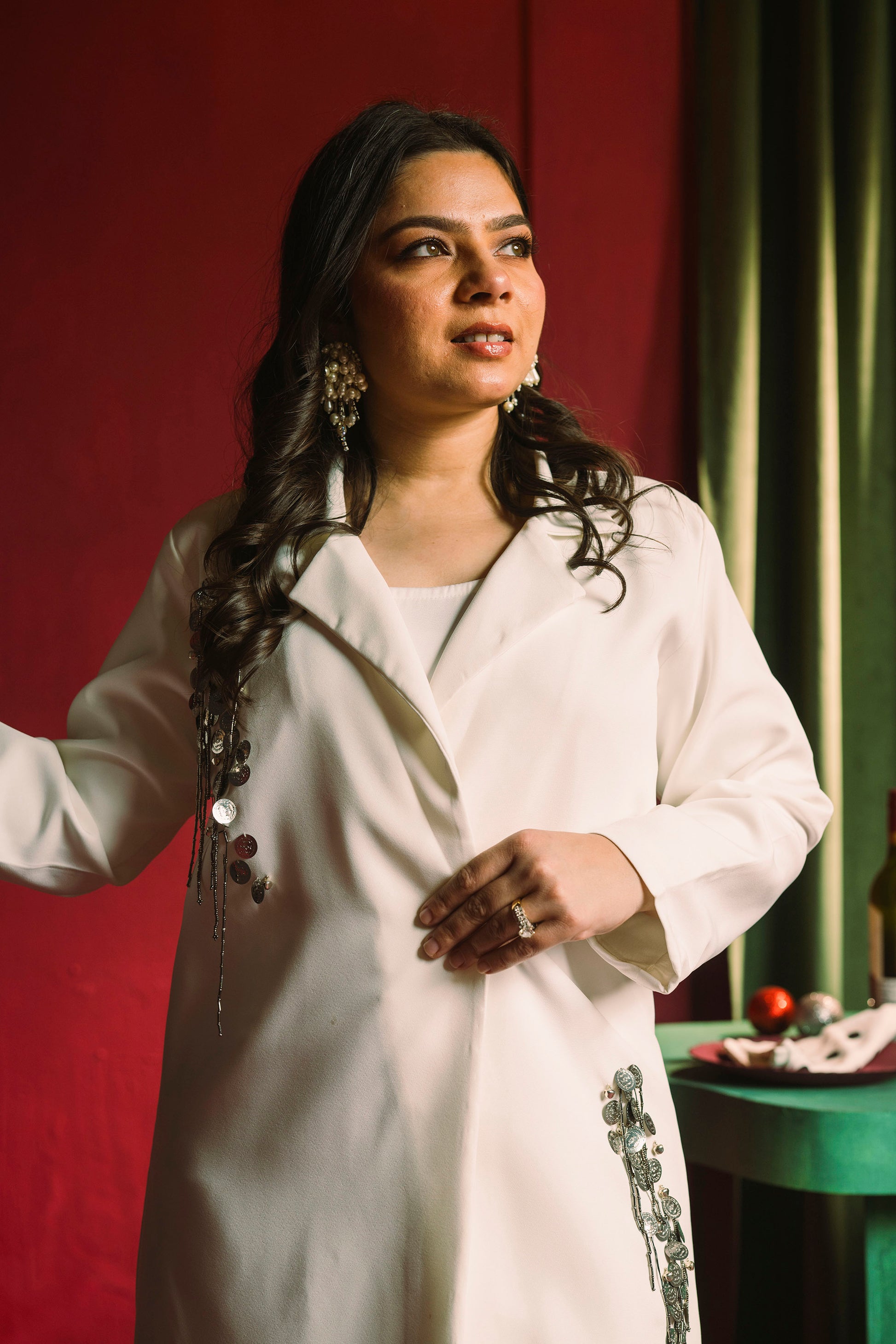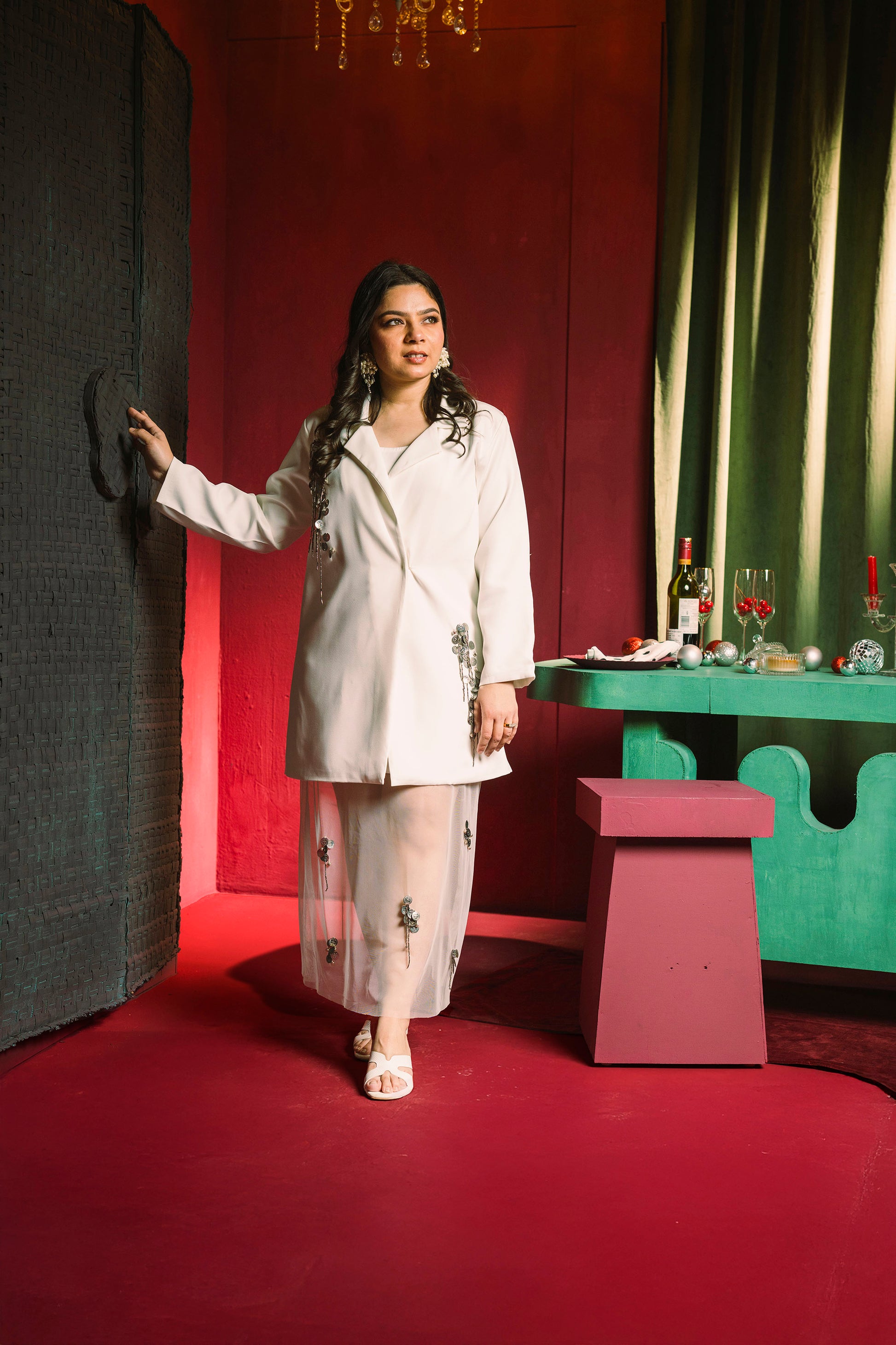 Embellished Blazer Dress with Mesh slip in White