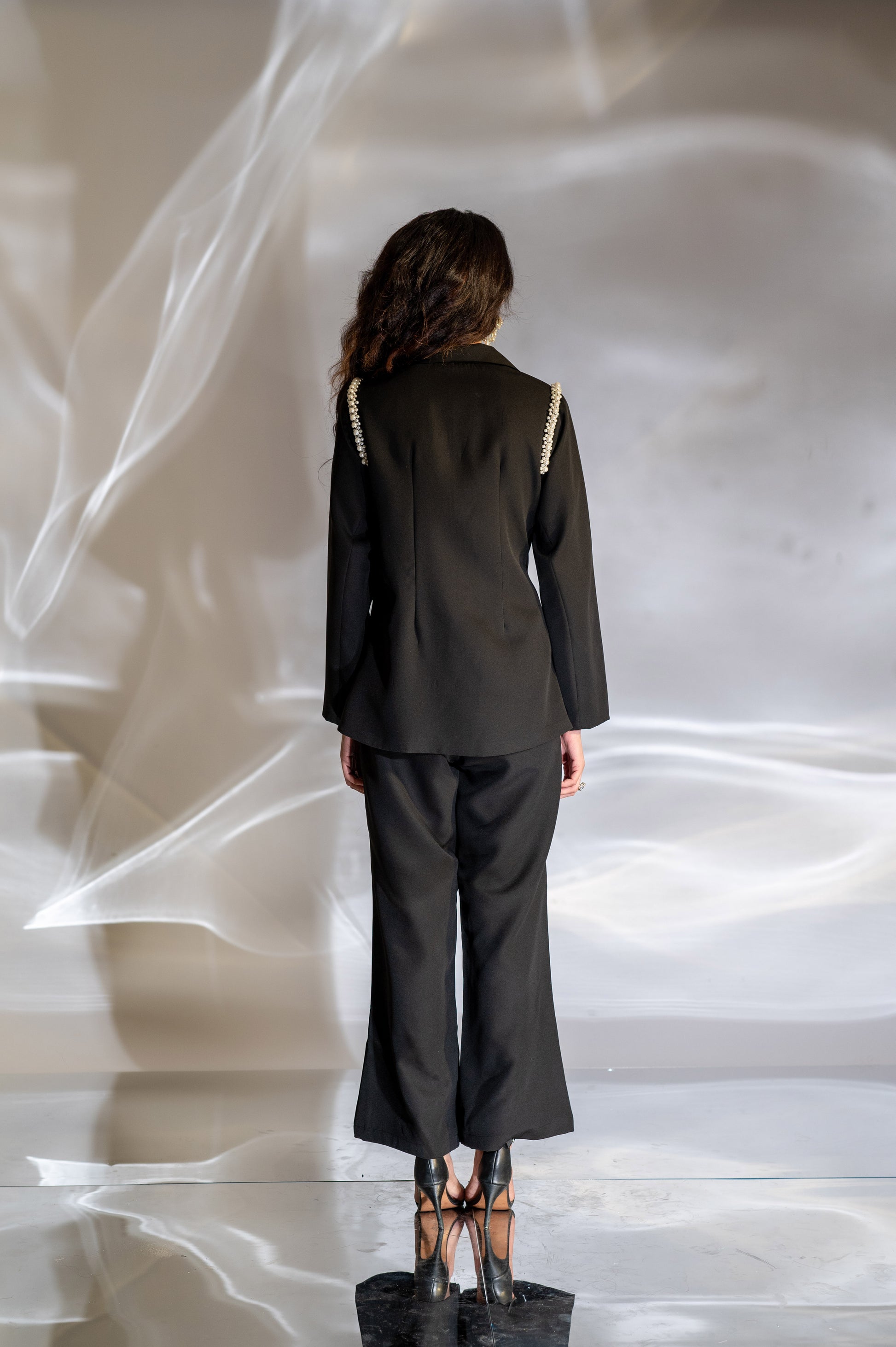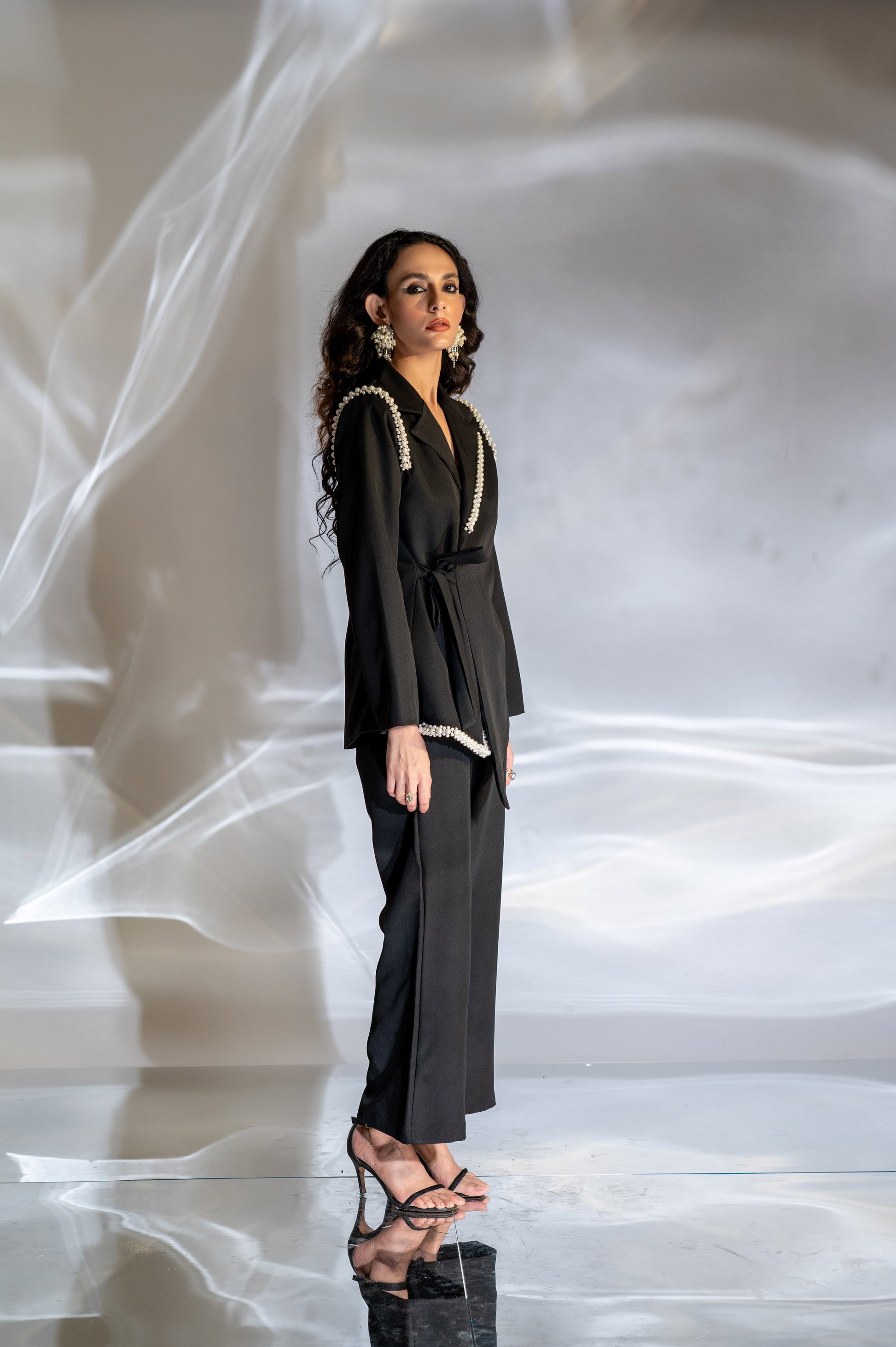 Pearl Embellished Waist Tie Blazer and Pant Set