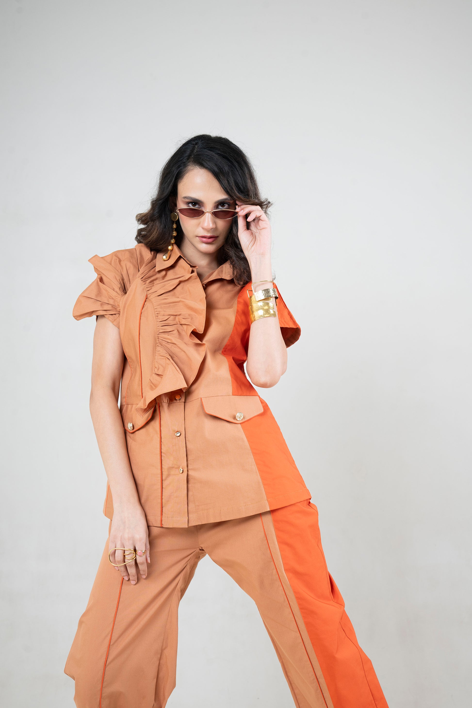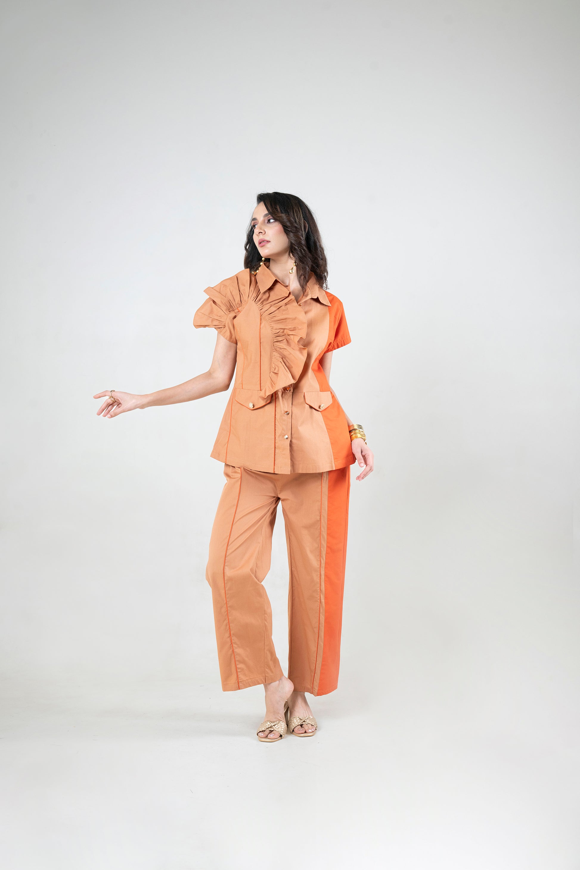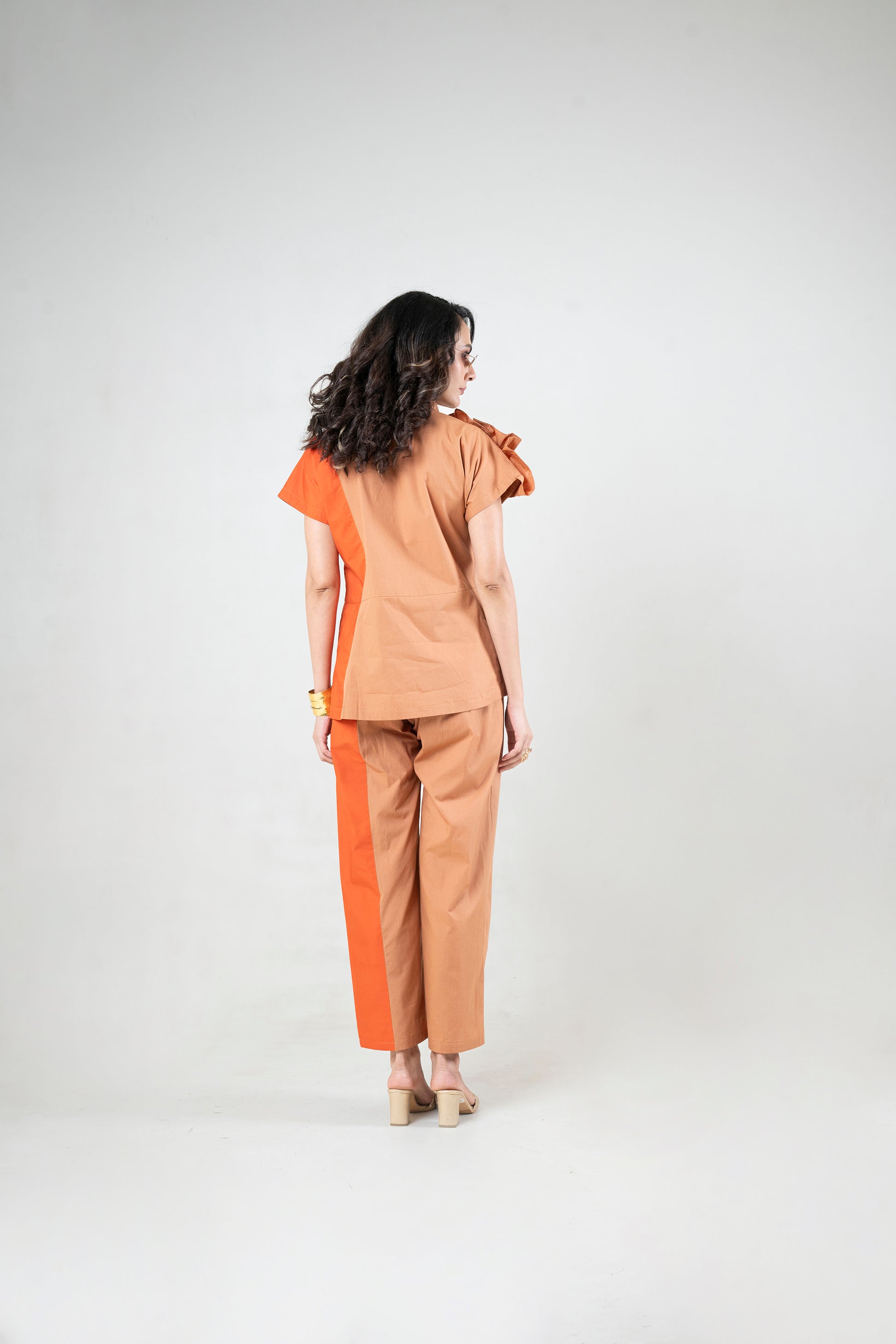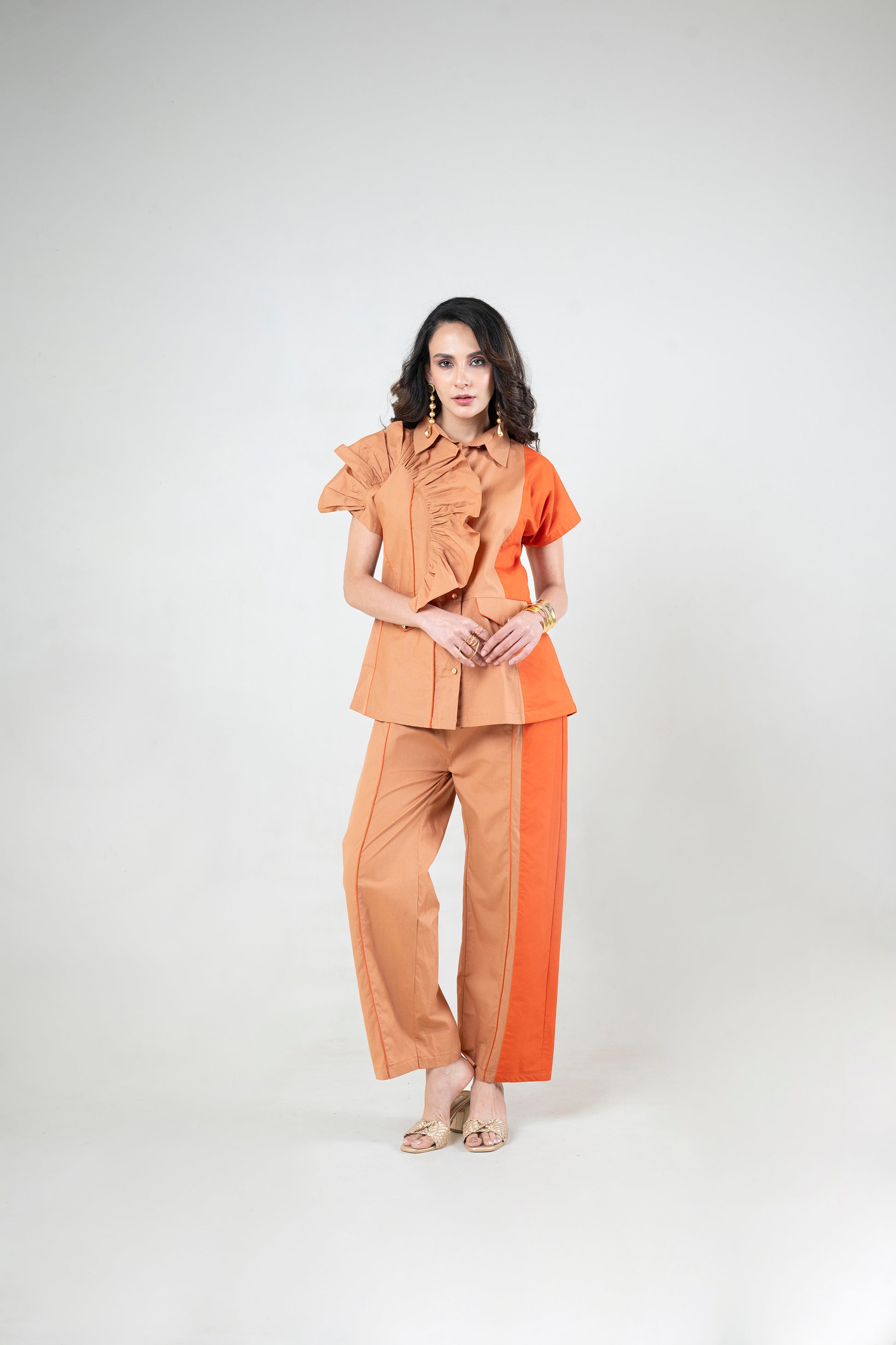 Ruffle Shoulder Co-Ord Set with Contrast Panel Detail